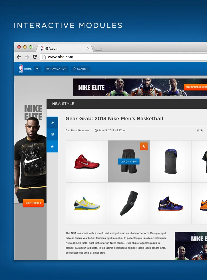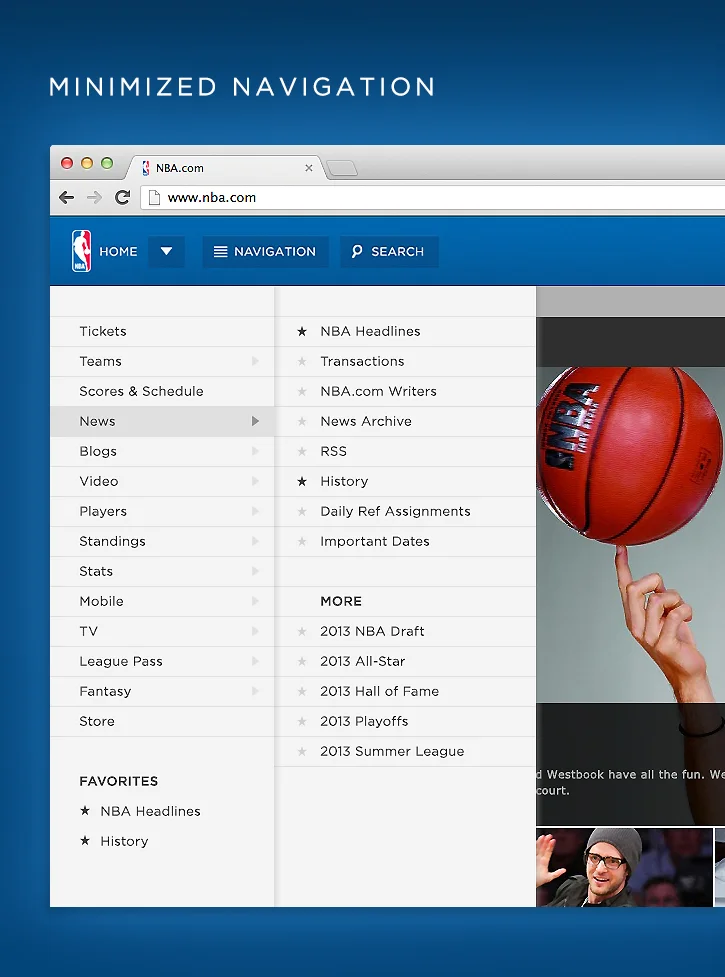 The following designs represent the next stage of design for NBA.com. Each page was built with usability in mind, putting content first, while tastefully integrating sponsor branding. These designs attempt to build constancy across all platforms, by developing an experience that helps unify the desktop, tablet and mobile versions of the site.